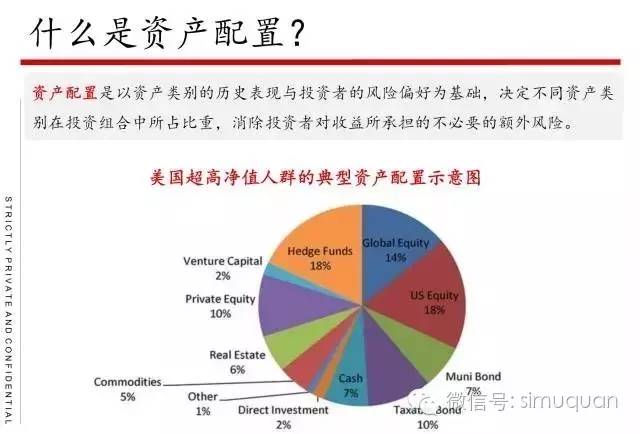 那么第二个,对于个人投资者,可以借鉴美国超高净值个人投资者的组合配置的比例。大家可以看到这个组合的产品类型是非常丰富的。有传统的股票、债券,股票当中又分为美国股票和全球股票,还包括对冲基金,会有一些另类投资如股权、VC、PE,包括一些不动产,包括大宗商品。这是一个美国超高净值人群典型的配置组合的图,会对大家有一些借鉴和参考的意义。