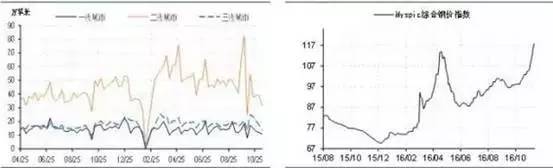 图表1 楼市成交面积继续萎缩 图表2 现货钢价床下年内新高